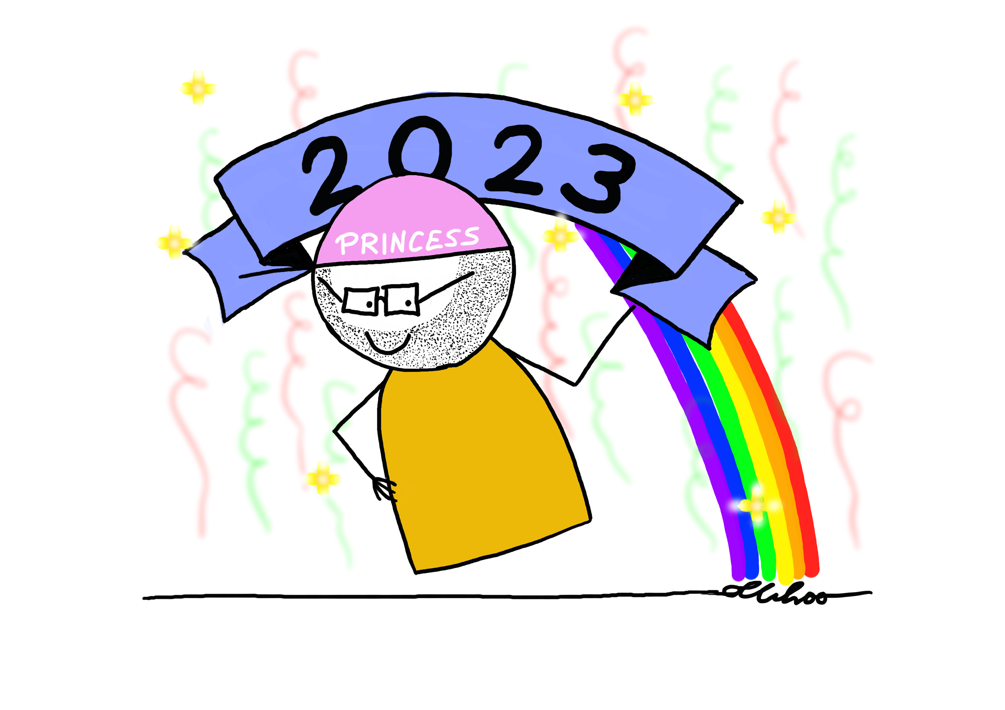 Eine Sektchnote-Figur mit Bart und Brille steht im Zentrum. Auf dem Kopf trägt die Figur einen rosafarbenen Käppi. Auf dem Käppi steht der Schriftzug "Princess". Hinter der Figur steht ein Banner. Auf dem Banner steht "2023". Im Hintergrund sind ein Regenbogen, Sterne, Konfetti und Luftschlangen abgebildet.Da ist wieder ein ganzes Jahr vorbei und es schreit nach einer Bilanz der letzten zwölf Monate. Was soll ich sagen, 2023 war in beruflicher Hinsicht sehr erfolgreich für mich. Ich habe etliche Workshops gehalten, Texte veröffentlicht, Interviews gegeben, auf Podien gesprochen …und das ist alles irrelevant.