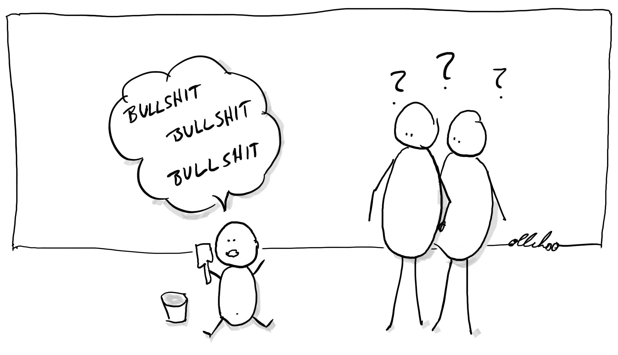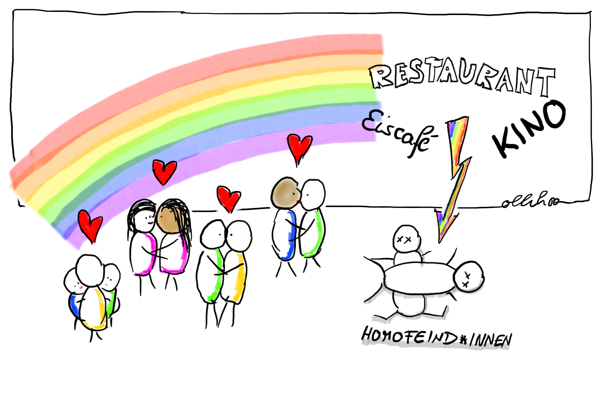 Wir laufen händchenhaltend auf dem Gehweg. Eine Fahrradfahrerin guckt uns ein paar Mal auf die Hände und wirft uns böse Blicke zu. Dann sagt sie: „Schlechtes Vorbild für Kinder!“ und düst davon.[1]