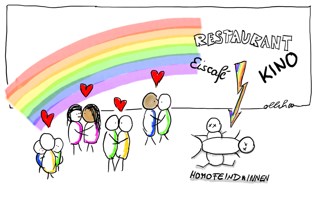 Der Ort, den ich mir vorstelle, mein queerer safe space, funktioniert nach demselben Muster. Ich stelle mir vor, dass es ein brandneuer Tag ist und zusammen mit der aufgehenden Sonne ist auch Queerfeindlichkeit aus der Welt verschwunden. Ich spüre das an meinem Körper, meine Mundwinkel gehen nach oben, mein Rücken richtet sich auf und mir ist fröhlich nach Lachen zu Mute. Ich gehe händchenhaltend mit meinem Mann auf die Straße und schlendere durch den Park. Kein Mensch wirft uns komische Blicke zu, niemand tuschelt, fragt seine Freund*innen, sodass wir es auch hören können, wer von uns beiden wohl der Mann ist? Uns rufen keine Kinder schwulenfeindliche Beleidigungen hinterher.